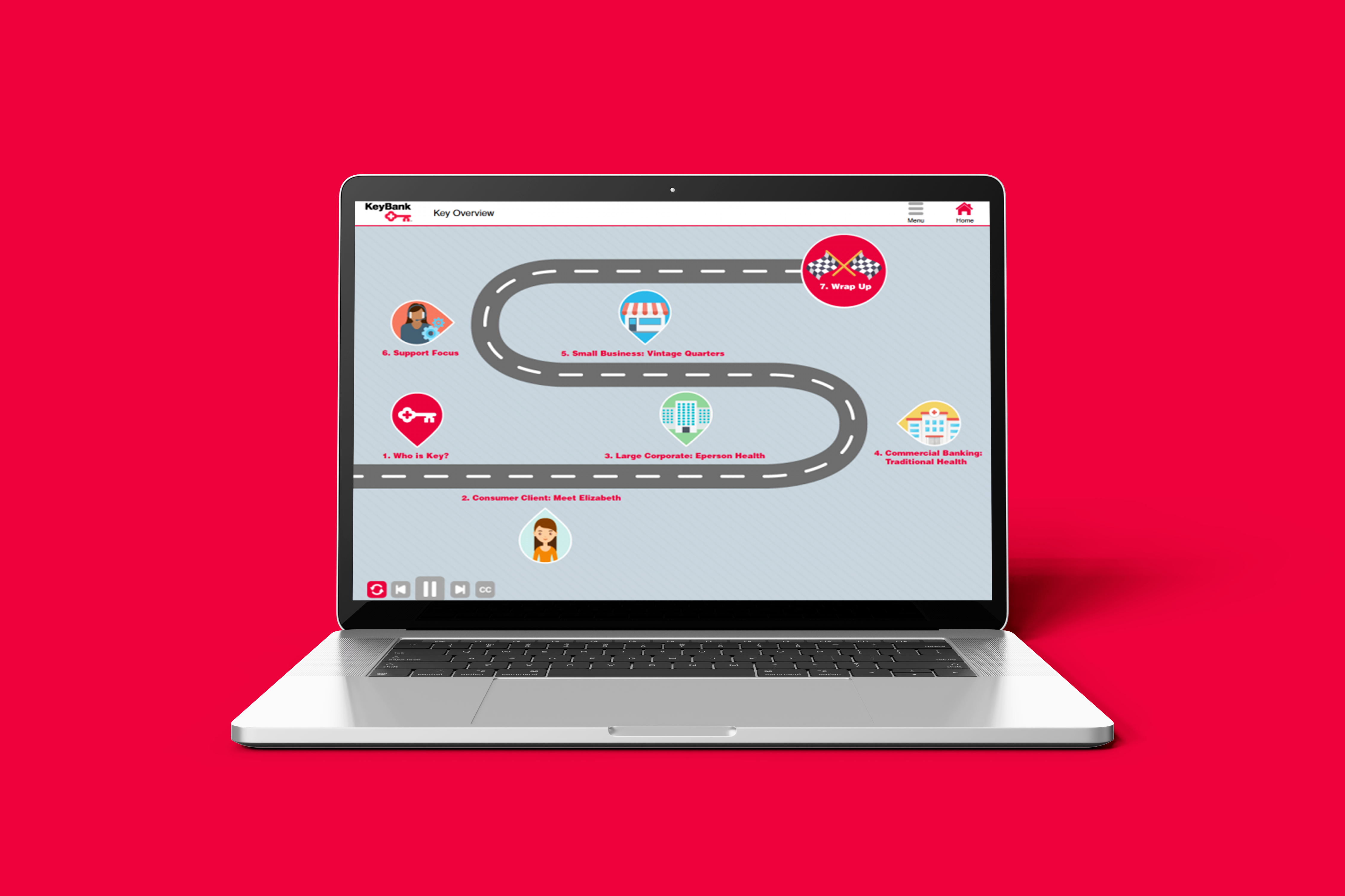 The course was structured into six primary modules, each following a logical, story-based sequence. The learners embarked on a journey alongside a fictitious client named Elizabeth, who initially approached KeyBank for personal banking services. As Elizabeth’s financial needs grew, the story unfolded, highlighting the collaborative efforts of KeyBank employees from different LOBs to provide the services Elizabeth required to achieve her goals.