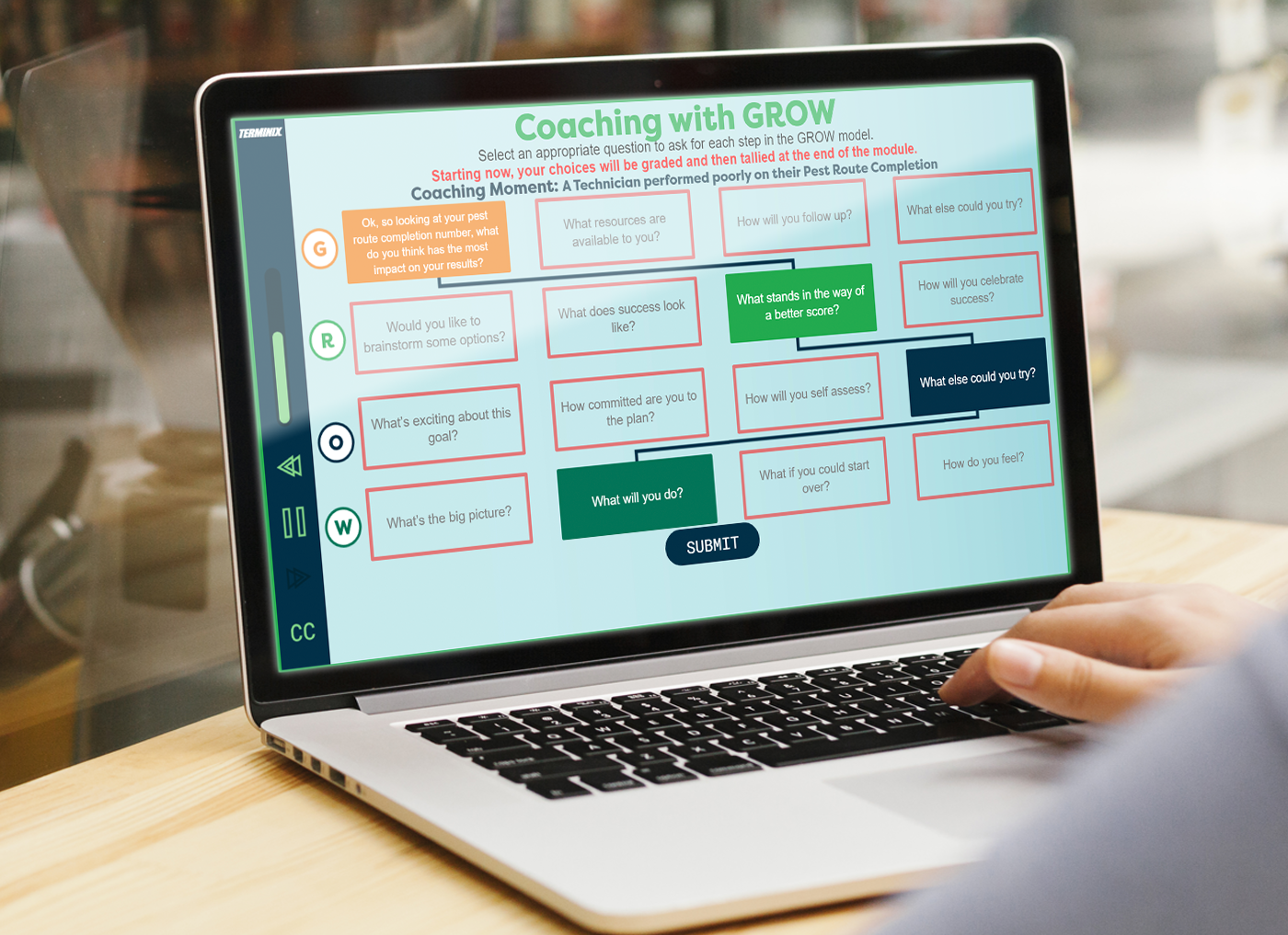 In this training program, leaders learn about coaching concepts and then make decisions based on those concepts related to their job role. The learner stays engaged through highly visual interactions they must complete moving through the training experiences.